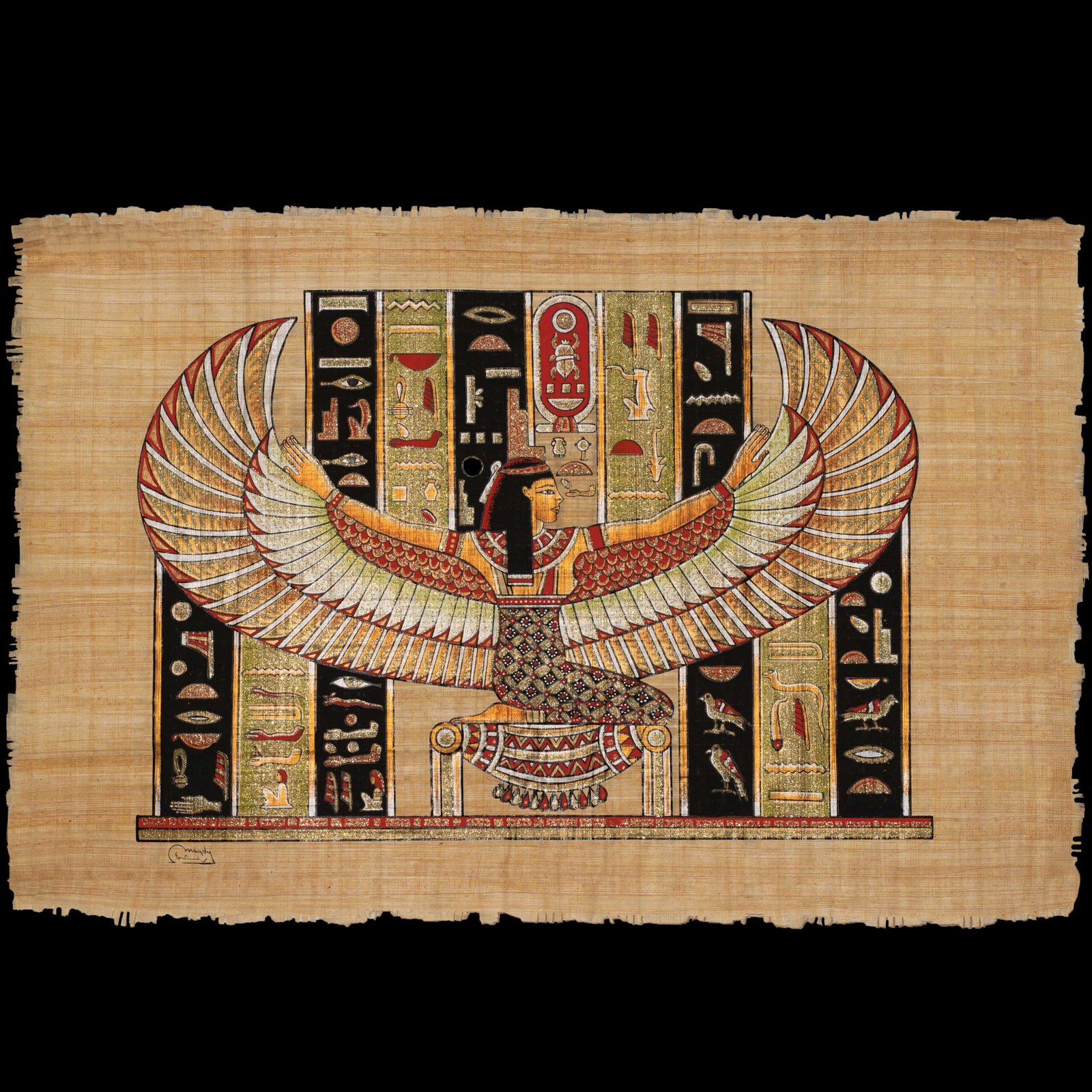 Experience the splendor of ancient Egypt with this exquisite Egyptian Papyrus Painting. This captivating piece of art features intricate hieroglyphs and a meticulously detailed depiction of a winged deity, encapsulating the rich cultural heritage and craftsmanship of ancient Egyptian artisans. The colors are vivid, and the traditional symbolism is evident in every brush stroke. Measuring [insert size], this unique artwork is perfect for collectors of Egyptian artifacts or as a striking addition to your home decor. Enhance your space with a touch of history and elegance.