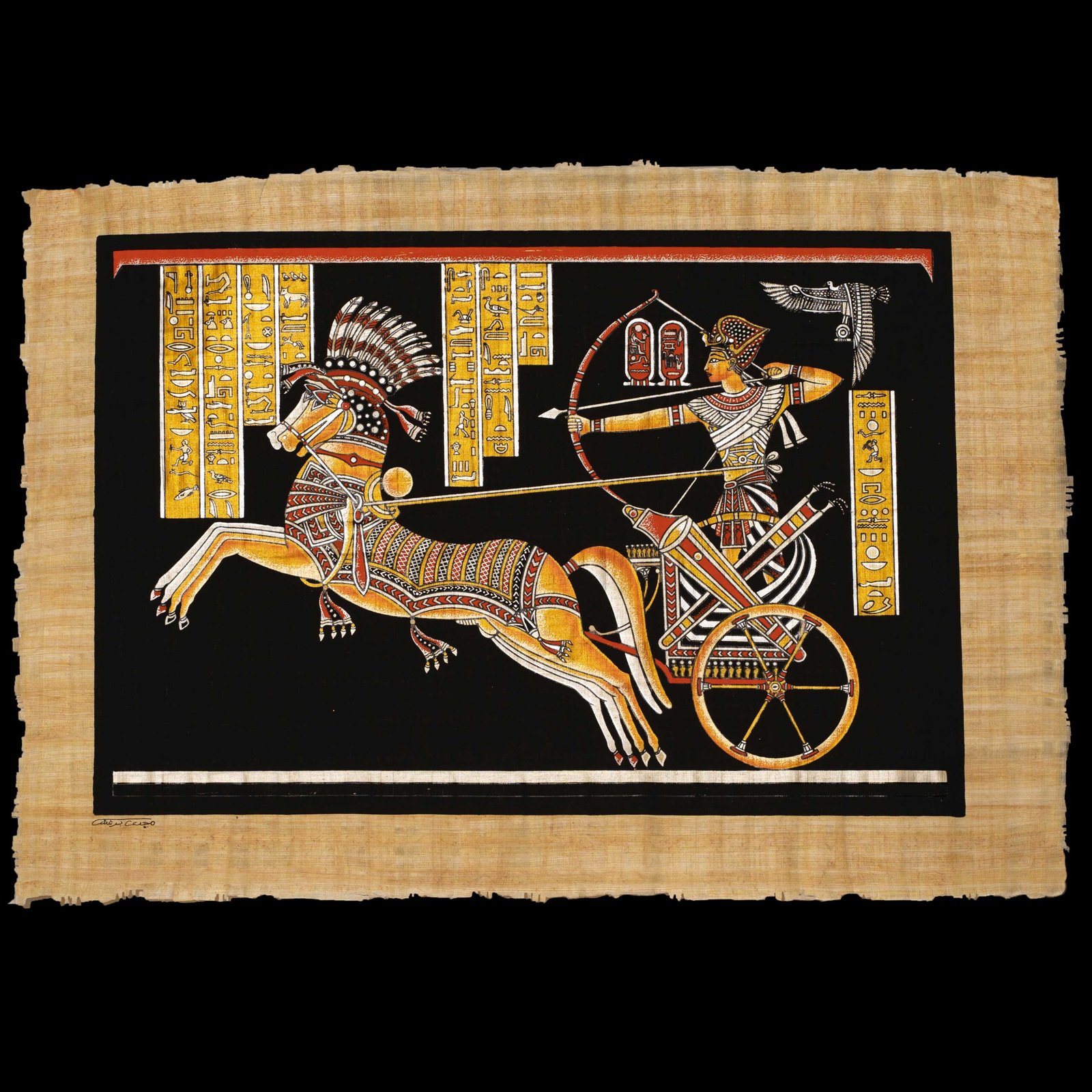 Relive the valor of ancient Egypt’s greatest warrior-pharaoh with “Ramses II at Kadesh”, a dynamic papyrus artwork capturing the legendary Battle of Kadesh. This historic confrontation between the Egyptians and the Hittites, fought around 1274 BCE, is one of the earliest battles recorded in detail. The artwork features King Ramses II standing boldly in a chariot drawn by two galloping horses, bow drawn, ready to strike. His commanding posture and traditional war attire reflect his role as both a divine ruler and fearless general. Surrounding the scene are authentic hieroglyphics and ornate Egyptian motifs, enhancing the historical depth and visual richness. Hand-painted on genuine Egyptian papyrus, this piece showcases traditional craftsmanship and storytelling. Ideal for collectors, educators, and history enthusiasts, this artwork brings the heroism and grandeur of Egypt’s 19th Dynasty into your space with striking authenticity.