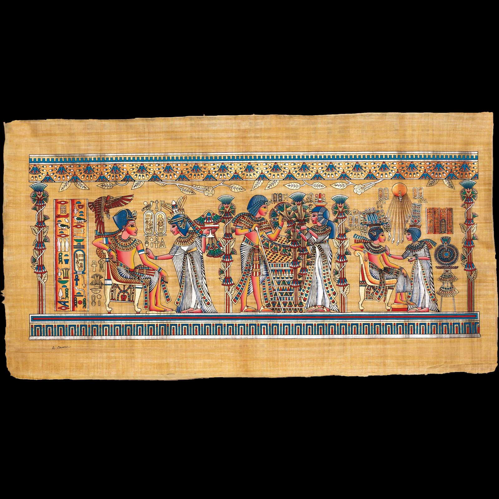 Experience the allure of Ancient Egypt with this exquisite Papyrus Artwork. Boasting intricate designs that capture the essence of traditional Egyptian scenes, this stunning piece is hand-painted on authentic papyrus paper. With its rich historical symbolism and vibrant colors, it’s a must-have for history enthusiasts and art collectors alike. Measuring approximately [insert size] inches, this artwork makes a captivating addition to any décor, infusing your space with timeless elegance and cultural depth.