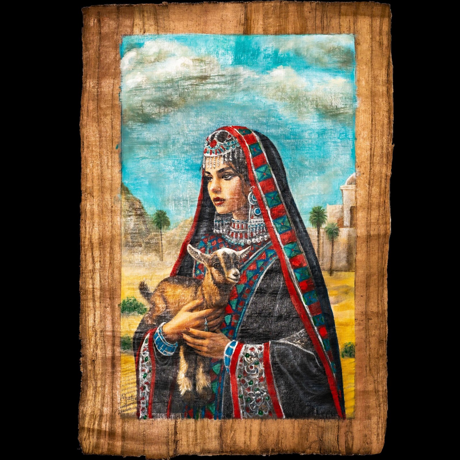Discover the timeless beauty of our hand-painted papyrus art, featuring a traditional Middle Eastern woman tenderly holding a baby goat. This exquisite piece crafted on authentic papyrus paper captures the intricate details and vibrant colors, bringing a touch of cultural elegance to any room. Measuring [include dimensions], this artwork is a splendid choice for those who appreciate artisanal craftsmanship and rich cultural heritage. Perfect for home decor or as a unique gift, this hand-painted masterpiece will effortlessly enhance any space.