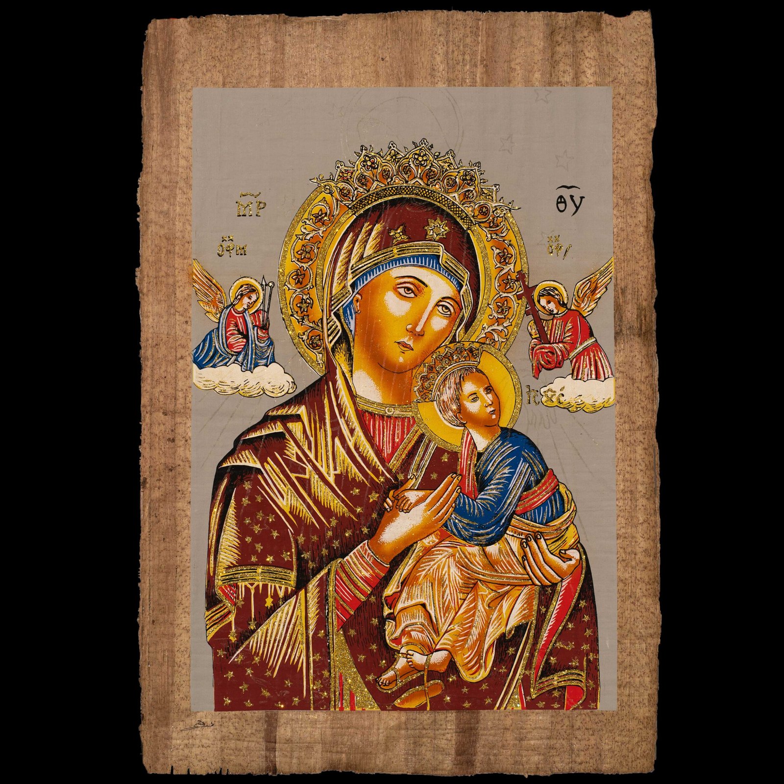 Immerse yourself in the spiritual beauty of “Sacred Embrace of Icons”, a richly detailed papyrus artwork inspired by Christian iconography. This piece features a central haloed figure holding a child, a traditional representation of the Virgin Mary and the Christ Child, rendered with reverence and symbolic depth. Though their faces are intentionally obscured, the composition radiates divine intimacy and maternal grace. Surrounding them are smaller, intricately painted figures, possibly saints or angels, set against a backdrop of ornate gold and earthy tones that reflect the sacred aesthetics of Byzantine and Coptic art. Hand-painted on authentic Egyptian papyrus, this piece blends religious symbolism with traditional craftsmanship, making it a meaningful addition to any spiritual or artistic collection. Ideal for collectors of Christian art, religious institutions, or those seeking a piece that conveys faith, protection, and divine love, this artwork is both timeless and transcendent.
